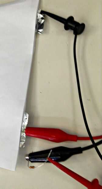 2. Fije los ganchos eléctricos de la fuente de voltaje de DC en el condensador: un clip a una ficha y el otro a la resistencia de 10 kOhm.