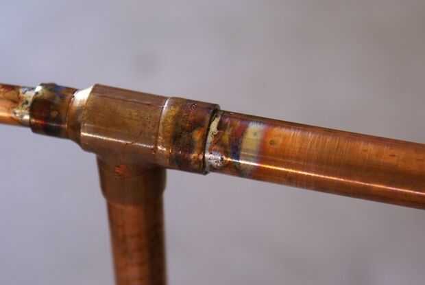 Una vez que haya terminado de limpiar, montar su trabajo y comienza a calentar la conexión con el soplete. Asegúrese de que la pieza se calienta lo suficiente y uniformemente. Sabe usted está lo suficientemente caliente una vez que usted presione la soldadura contra él y simplemente fluye justo en los huecos. No necesita un montón de soldadura y se extenderá fácilmente alrededor en todas las lagunas si la temperatura es correcta.