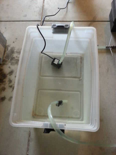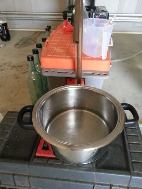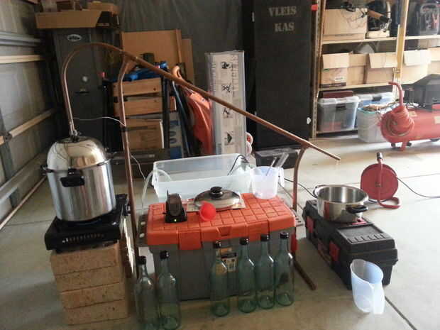 Aquí le damos un par de fotos del condensador de Liebig en acción. Como se puede ver, es una pequeña puesta a punto y yo sólo puedo destilar unos 5 litros de lavado a la vez.