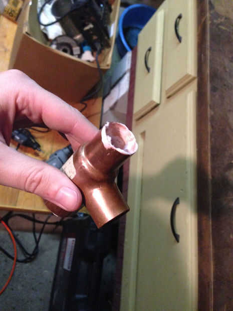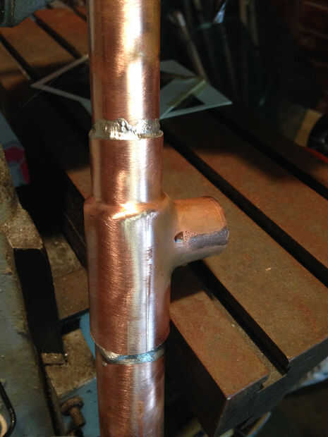 Ahora una vez que los enfría el tubo t y 1" al tacto Deslice el tubo de 1" y Tee en la tubería de 3/4" para que el tubo exterior 1" está en el centro de la tubería de 3/4". Se mancha el flujo de la abertura de salida superior 3/4" pero eso está bien, solo se aplica más alrededor de la articulación y luego suelde celebrada en un vicio como similar al anterior. usted debe terminar con la tercera foto de este paso.