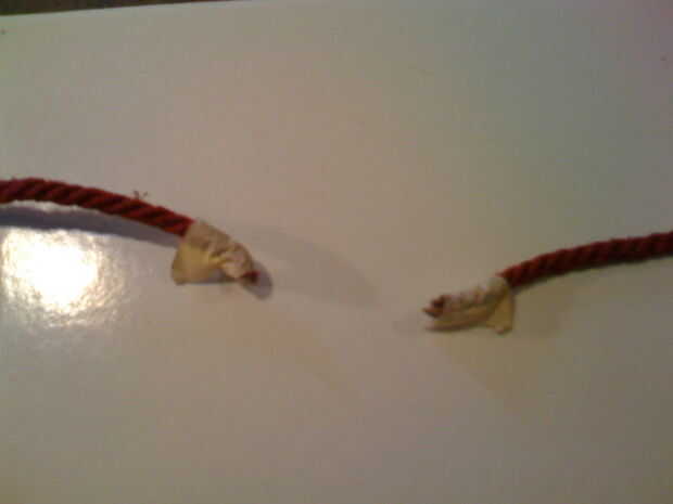 Decidir cuánto tiempo desea que su pedazos de cuerda que. Me gusta 15' y 30' de piezas. Utilice una cinta métrica y envolver trozos de cinta adhesiva alrededor de la cuerda para marcar donde vas a cortar. Cortar en la mitad de la cinta de modo que cada extremo de la cuerda se mantiene unida y no desentrañar.