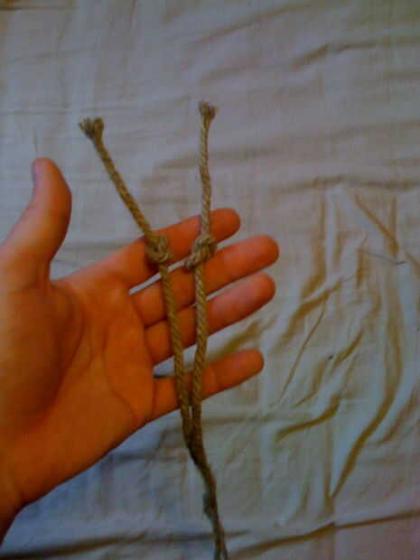 Ochenta y tres metros de cuerda es extremadamente difícil de trabajar, así que vamos a cortar en algunas piezas. Encontrar los dos extremos de la cuerda y ATA un nudo en cada extremo la cuerda no desentrañar. Encuentre la media y sentir a través de la cuerda. Cortar con las tijeras EMT y atar otro nudo en cada uno de los extremos nuevos. Repetir este proceso para cada una de las dos piezas para que acaben con cuatro pedazos de igual longitud de la cuerda. No corte la cuerda a la longitud deseada ahora mismo como vas a perder un poco de longitud durante el acondicionado y azotes procesos.