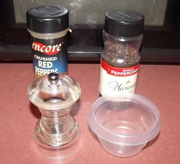 Necesita una amoladora de pimienta recargable o búsqueda instructables sé hay al menos un "ible" en rellenar un tipo desechable Haz un tazón pequeño o taza que lo suficiente para llenar su amoladora un frasco de pimienta en grano, puede usar cualquier color o combinación que prefiera Un vaso de copos de guindilla seca