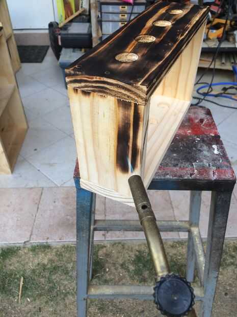 Para darle un acabado de quemado puede usar una antorcha de propano (más rápido) aunque puede quemarlo como más le guste.