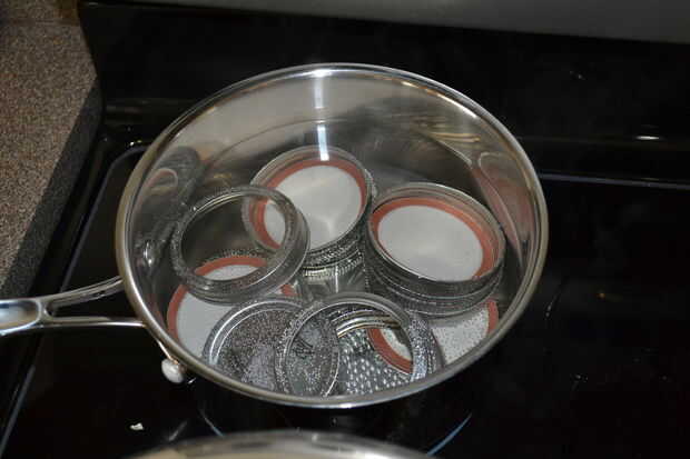 Primero, lavar mi pint conserva frascos en el lavavajillas y mantener caliente hasta que estaba lista para ellos. A fuego lento mi las tapas y los anillos en agua caliente y me mantuvo caliente así.