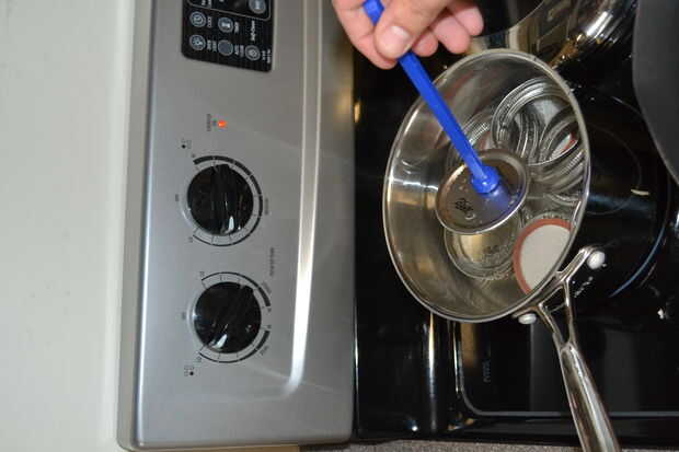 Envían la mezcla en los tarros de cerveza caliente dejando sobre una media pulgada de espacio de cabeza (puede utilizar una herramienta de medición). Limpie los bordes del tarro con un paño húmedo y, utilizando una varita magnética, quite los bordes y las tapas de la agua caliente, apriete a una tirantez de la punta de los dedos en los recipientes.
