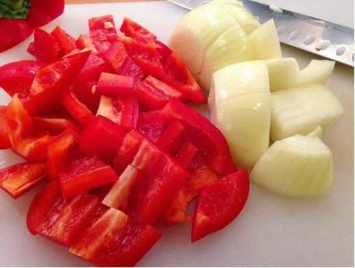 1. Picar los pimientos y las cebollas en cubos