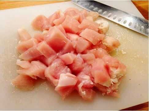 3. Luego usando una tabla de picar diferentes cortar la pechuga de pollo en mordedura de tamaño trozos