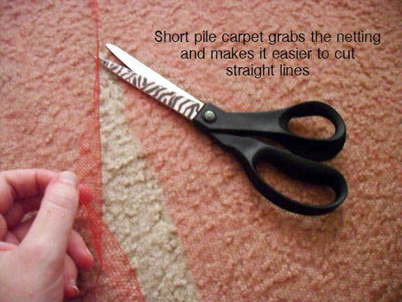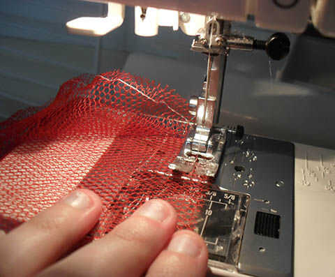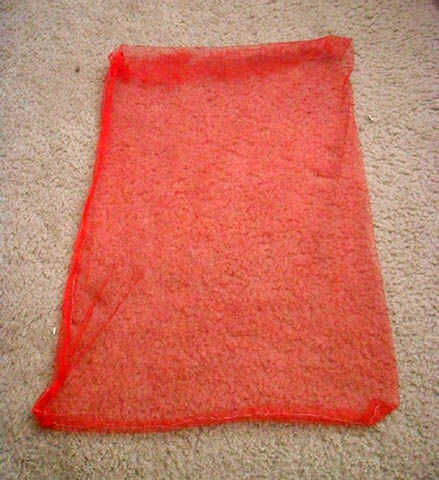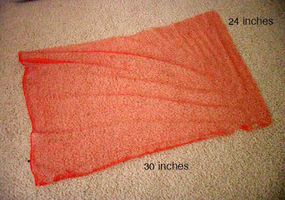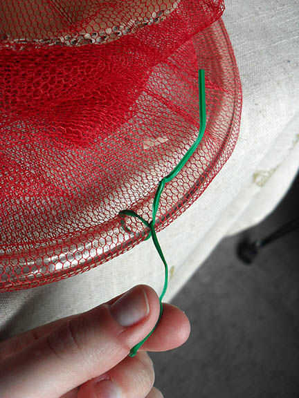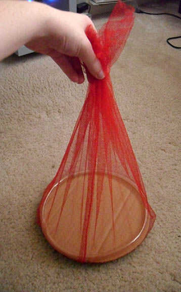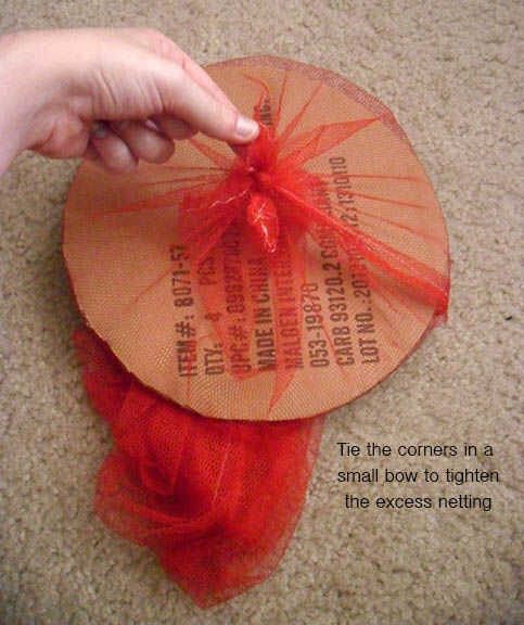 Recoger la malla sobrante en la parte superior como si se va a llevar como una bolsa. Nudo de cerca de los extremos de la red.