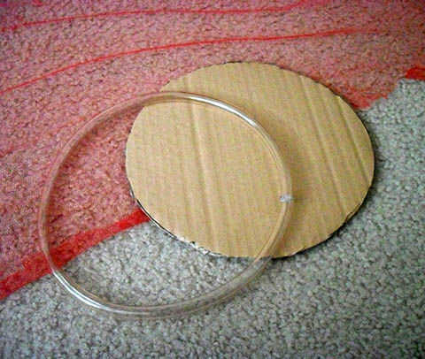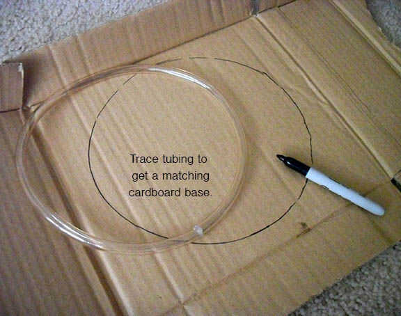 Cortar un anillo de tubo de acuario de plástico hueco. También se puede utilizar alambre revestido plástico, si lo desea, pero mantenerlo pequeño y ligero. Este anillo será el diámetro de su espacio de refugio. Puesto que ya hemos averiguado las medidas de compensación para un círculo de diámetro de 9 pulgadas, voy a espejo que aquí.