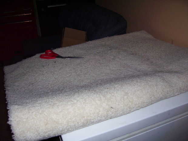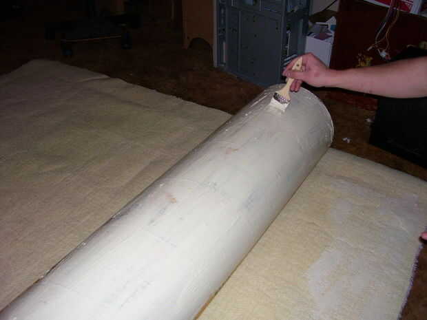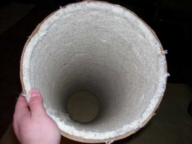 Ahora es el momento para cubrir el interior del tubo con alfombra. El interior del tubo es difícil de alfombra, ya que es duro de trabajar dentro del pequeño espacio en el tubo. Lo que hicimos, es en primer lugar medimos para ver cuánta alfombra necesitamos para cubrir el interior y cortado a la medida. A continuación, lo ponemos dentro para ver si cabe. Una vez que tuvimos un buen ajuste, ponemos pegamento en la parte superior y alrededor de la parte inferior del tubo. A continuación enrolla la alfombra y se extendía a lo hacia fuera dentro del tubo, por lo que fue ajustado, a continuación, para mantenerlo en su lugar mientras el pegamento seca y a virar hacia abajo aún más, utilizamos la pistola de grapas, para poner grapas en la parte superior e inferior y todo el camino hasta la costura de la alfombra. Las grapas se entierran profundamente en la alfombra y son prácticamente invisibles, así que usted puede dejarlas.