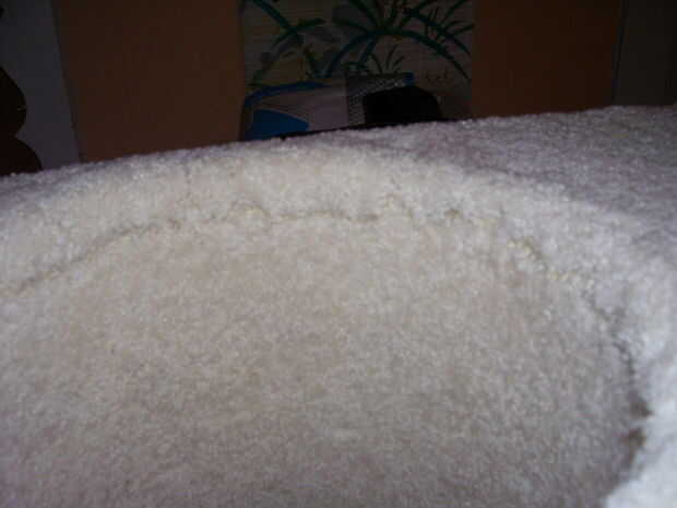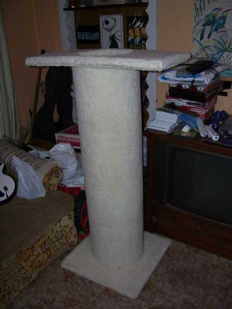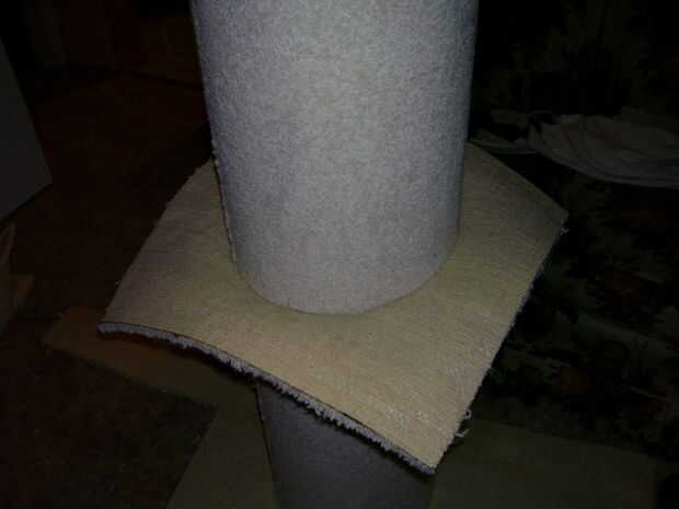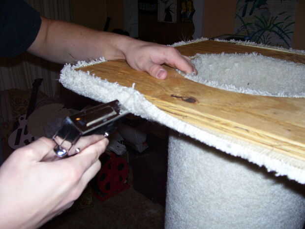 Ahora puede cubrir la base y la tapa con la alfombra. Usted puede utilizar el adhesivo en estos, pero no tienes que. Grapas funcionará igual de bien. A alinear las piezas y virar los bordes en el interior y exterior, con la pistola de grapas. A continuación, tire de la alfombra sobre los bordes de la madera y virar la alfombra a los bordes de la madera con grapas. Asegúrese de cortar las esquinas de la alfombra, por lo que no tiene extra en las esquinas. Ahora, fije la alfombra al otro lado de la pieza superior de la madera. Esto si dejo con todos los lados a la pieza superior de la madera, excepto los bordes dentro del agujero circular, y la alfombra dentro del tubo debe cubrir estos. Esto debería dejar también con sólo la parte superior y fuera de los bordes de la base cubierto así. No cubra la parte inferior de la base, porque se sentará en el piso.