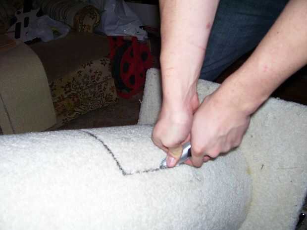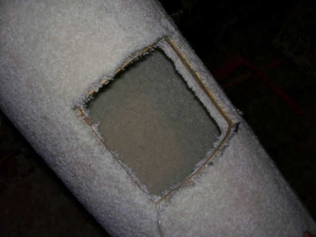 Ahora que los agujeros están marcados, estamos dispuestos a cortar hacia fuera. Básicamente, sólo utiliza una navaja muy filosa y mantuvo que la alfombra en las líneas, hasta que corta a través de la alfombra y parte de la cartulina, y sólo seguimos cortando a lo largo de esas líneas, hasta que se cortó todo el camino a través de la capa superior de la alfombra y el cartón, y luego utilizamos tijeras para cortar el resto del interior capa de alfombra. Hicimos esto para los tres de las aberturas que hicimos.