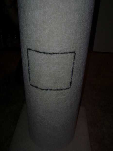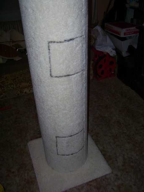 Ahora es el momento para que se vea como un condominio de gato. No importa donde pones tus las aberturas, pero te diré a donde ponemos nuestra. En primer lugar, decidimos que 7 pulgadas cuadrados sería un buen tamaño de apertura, basado en el tamaño del tubo y el tamaño del gato que está siendo construido para. Así que queríamos dos orificios en un lado y una abertura en el otro lado. Esta manera, dejaría la parte trasera y delantera sin tocar, por lo que podría ser colocado contra la pared, sin ningún problema. Decidimos que queríamos nuestras aperturas cerca de 9 pulgadas de los bordes de un lado y del otro lado, queríamos que la abertura en el centro. Así el marcador en la primera parte con el marcador negro, cerca de 9 pulgadas para arriba de la base y cerca de 9 pulgadas abajo de la parte superior. Luego mide 7 pulgadas a través y marcó. Y entonces medimos el resto de las plazas de 7 pulgadas y había marcado con el marcador negro. En el otro lado, sólo tomamos la longitud (48 pulgadas) y restar las 7 pulgadas para la apertura de él, y que nos dejó con 41 pulgadas. Entonces tomamos esa 41 pulgadas y dividido por dos, para darnos 20.5 pulgadas. Así que inventamos una marca 20.5 pulgadas desde la base y 20.5 pulgadas abajo de la tapa, a darnos la parte superior e inferior de la abertura. Marcamos la Plaza de 7 pulgadas de ese lado con el marcador negro también.