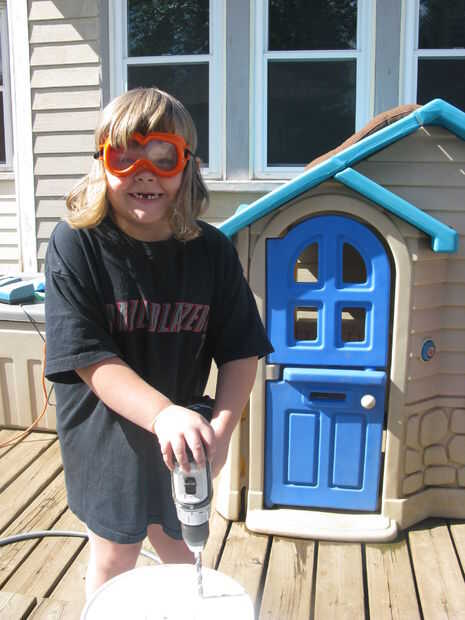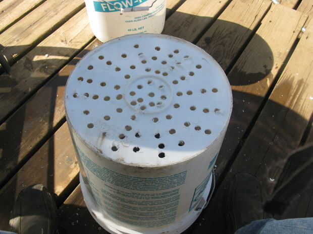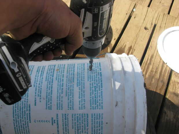 En el siguiente cubo taladro un montón de agujeros en la parte inferior (y recuerdo cuando jugando con herramientas eléctricas siempre use sus gafas de seguridad). Basta que no acumule agua o jugo. Los agujeros deben ser lo suficientemente grandes para los gusanos arrastrarse a través. Pero no haga tantos que la parte inferior del cubo saldrá con peso añadido.