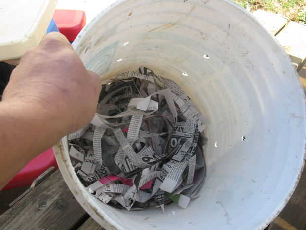 Desde cada una de mis hojas de cubos aproximadamente 4 pulgadas de espacios cuando se apilan. Así que en el cubo con todos los agujeros yo llenarlo con acerca de 2 pulgadas de periódico triturado (no la materia brillante). A continuación os pongo en los gusanos y restos para comer 4-6 pulgadas de la parte inferior de la cubeta. Luego hacer lo mismo con el resto de los cubos agujereados.