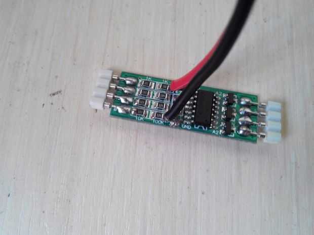 Ver la foto de arriba. En el extremo de la salida de un amplificador hay tres MOSFETs de canal N, como se describe en el paso 2 de este instructivo. Junto a ellos se encuentra un chip inversión lógica que proporciona voltaje a la compuerta de lo mosfet cuando no hay nada en su entrada respectiva y viceversa. El amplificador funciona muy simplemente: trata de tensión (sin carga) a través de cada canal de entrada. Si se hunde (el canal respectivo es conectado a tierra, lo que significa los LEDs), nada va al chip del inversor, por lo que proporciona tensión a la puerta MOSFET, que a su vez se abre el canal de salida. Si no es así, la tensión va al inversor, el MOSFET de cierre.