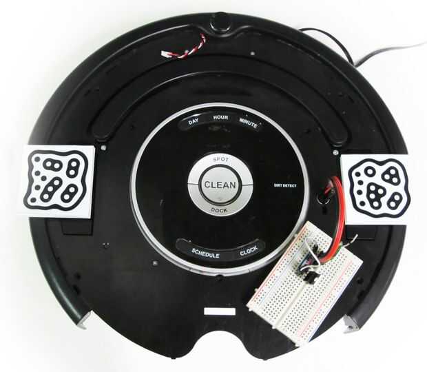 Usando cinta de doble cara u otros adhesivos, Coloque 2 marcadores fiduciales a tu Roomba de forma que estén a la misma distancia desde el centro del robot