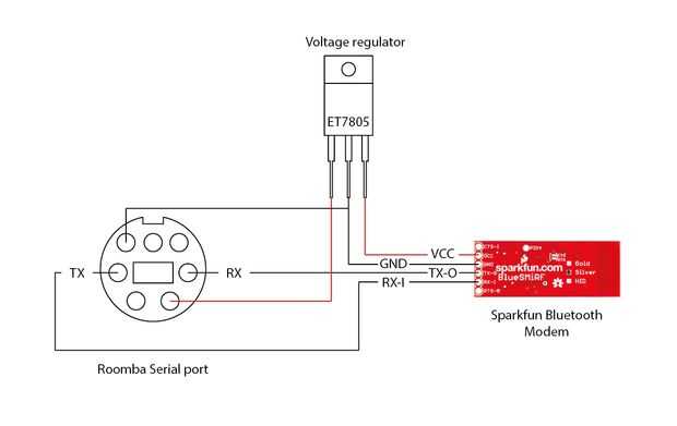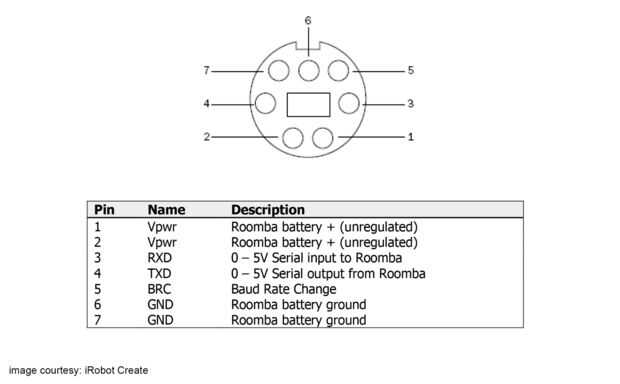 Para este proyecto sólo vamos a necesitar 4 de 7 pines en el puerto de datos de Roomba. Para el módulo de control de Bluetooth vamos a necesitar RXD (pin3), TXD (pin4), Vpwr (pin 1 o 2) y GND (pin 6 o 7).