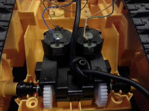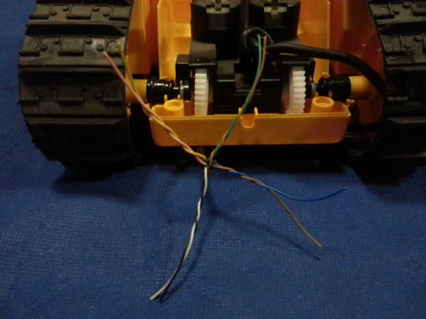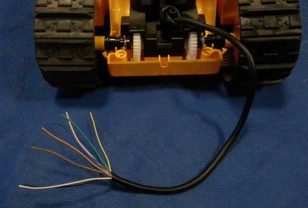 Medí una cantidad suficiente de la correa de mando a distancia para alcanzar la parte superior del chasis y cortar con el cortador diagonal. Después de pelar una longitud de la cubierta exterior me emparejó los colores de los cables en la caja de batería y tres motores y creó los cuatro pares relacionados. Una pareja lleva los 6 voltios de la batería. Tres otras parejas controlan tres motores.