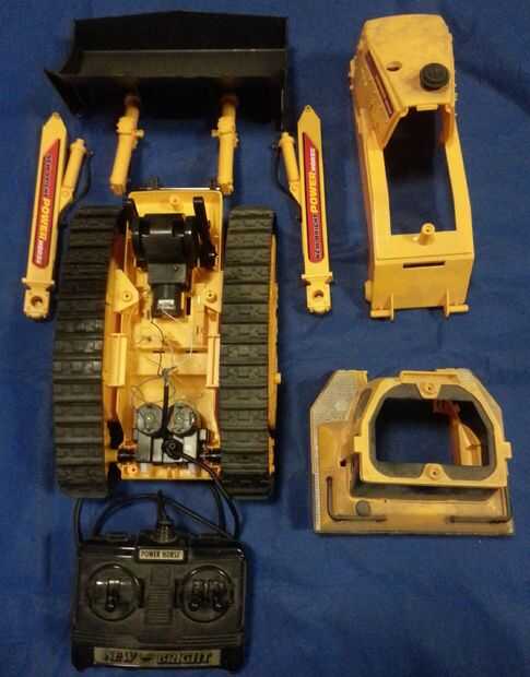 Para el nuevo Brite atada bulldozer remoto utilizado en el ejemplo hay varios tornillos en la parte inferior que la superior la mitad de la carcasa de plástico en su lugar. La cabina también puede ser separada del cuerpo principal para proporcionar acceso al compartimiento del motor desde la parte superior después de que se vuelva a armar el cuerpo principal.