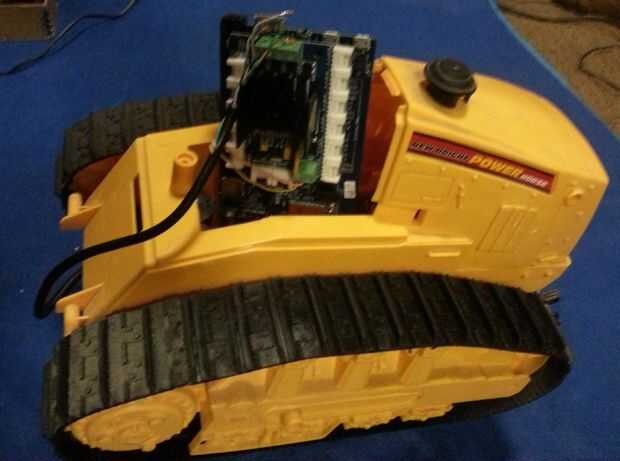 Conecte los dos cables del motor de un coche a un par de terminales para control del motor en el escudo. Conecte los cables desde el motor al otro par de terminales para control del motor en el escudo. Tenga en cuenta que en este particular juguete los motores tienen que girar en diferentes direcciones para el bulldozer rodar hacia delante o hacia atrás. Puede cuidar de que cambio motor conectando uno establecido hacia atrás sobre el escudo, o invirtiendo en todas las direcciones en su control motor Arduino sketch. Decidí cambiar los conductores del motor en el escudo para que la programación sea más diciendo constantemente un motor para hacer girar hacia adelante y tener esa pista rodar hacia adelante.