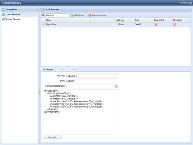 Nota que yo he especificado formato big-endian (< endian formato = "grande" >) y se han añadido las variables que representan los tres ejes muestreados por el acelerómetro: x, y y z. El tipo de estas variables es "16", que es corto de mano para 'entero sin signo de 16 bits'. Se admiten diferentes tipos de variables; puede encontrar más información en el SensorMonkey de la Página de soporte.