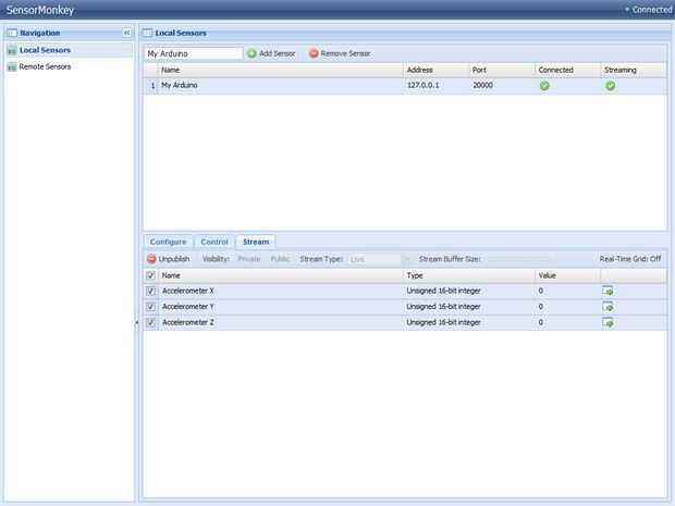 Después de hacer clic en 'Conectar', vaya a la pestaña de 'Corriente', seleccione las tres variables de acelerómetro, elegir un tipo de 'Público' y haga clic en 'Publicar'. Los datos del sensor ahora que es transmitidos en vivo por Internet como una secuencia pública en mi espacio de nombres personal.
