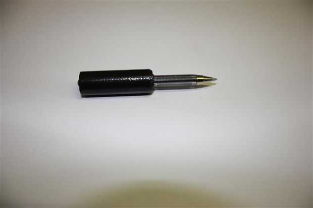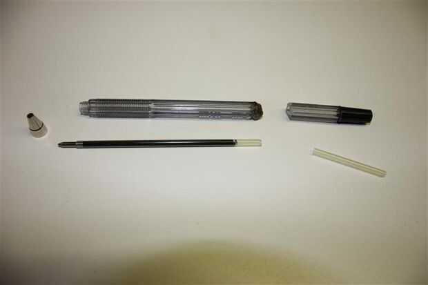 -Para acortar la pluma, usé la sierra para acortar el cañón de la pluma. Una vez el cañón fue acortado, usé un encendedor para derretir el plástico en la parte posterior para que no caiga el cartucho de tinta. El cartucho de tinta también tendrá que acortarse pero es necesario utilizar un cartucho donde la tinta había sido utilizada más allá de donde usted necesita para cortarlo.