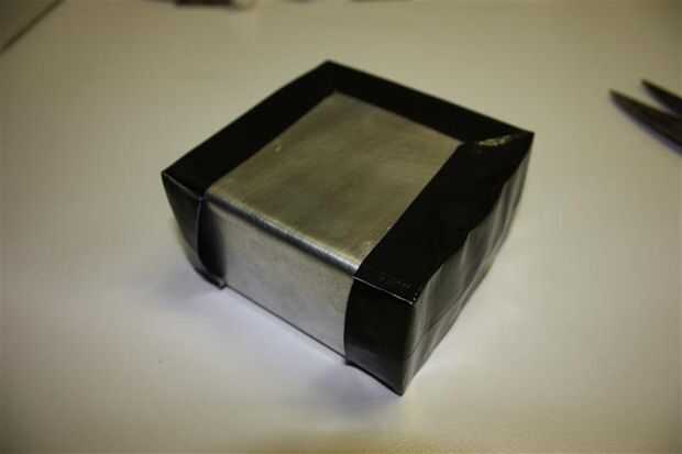 Conocer la parte de mi caja son 100 x 100 mm y 50mm de ancho. Esto significó que necesito cinta 350mm largo y ancho de la caja. También debe ser un punto débil en la cinta donde puede rasgar fácilmente. Esto se puede hacer grabando 3 piezas con 2 piezas al lado de uno y una tercera pieza lado pegajoso pegajoso por la mitad.