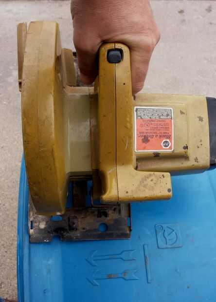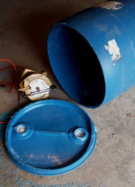 El tambor de 55 galones que compré ($10) tenía la tapa firmemente colocada en la parte superior. Había establecido el cañón a su lado y, con la tapa como guía, corte la parte superior del tubo de la tapa y todo, rodando el barril por el suelo hacia mi y el filo de la hoja de sierra circular. Si alguna vez hago otro, podría tratar de primer corte en el interior de la parte superior, tal vez con una sierra de calar, dejar el borde intacto. Este método añadiría más rigidez estructural que el tubo resultante, que termina un poco flojo usando el diseño actual.
