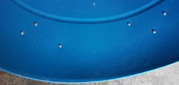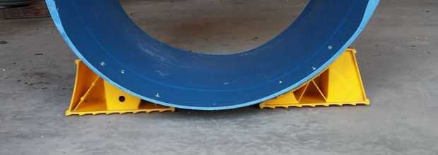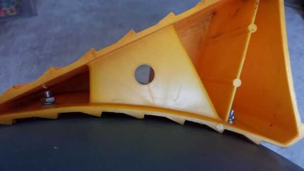 El barril se debe estabilizar por lo que se puede rodar de lado a lado. Hay algunos elaborados medios de lograr esta estabilidad, pero usé algunas cuñas de la rueda extra que tenía en mi RV Este conjunto estaba a punto de caducar de todos modos. Estas estructuras plásticas están diseñadas para evitar que las ruedas de la caravana cuando estacionado en una superficie desigual y así que son perfectas para esta aplicación. Configurar las cuñas de la rueda junto a la primera de dos anillos que rodean el cañón, que supone añadir rigidez a su forma. Coloque justo en el borde en parte porque las curvas del cañón, estrechamiento de diámetro hacia el extremo. Colocó 6 1/2" aparte como se muestra, o lo suficiente como para conseguir lo que será la parte inferior del tubo del piso. Taladré orificios 3/16" a través del cañón y en la cuña de la rueda en 3 lugares para 10-24 x 3/4" cabeza redonda tornillos. Cada agujero penetrado la capa exterior de la cuña única, permitiendo que la tuerca para conectarse desde dentro de la cuña de la rueda. Por supuesto, utilicé una arandela plana y arandela bajo la tuerca y una arandela bajo la cabeza del tornillo para distribuir la tensión sobre un área mayor. Tuve que utilizar alicates de punta para colocar la lavadora y sujete la tuerca, mientras que en atornillar del otro lado. Aunque más difícil, este procedimiento coloca las cabezas de los tornillos en el interior del tubo, que a menos de un peligro de lesión a los perros que los extremos roscados. Me mantiene la cuña en su lugar y perforar el primer agujero a través del cañón y la cuña. Poner el tornillo en el agujero, lo apretó y ajustar la posición de la cuña. Igualmente he añadido que los otros dos tornillos uno a la vez por lo que no tengo ninguna dificultad haciendo coincidir los agujeros. Colocar los tornillos en un patrón triangular para la estabilidad. Al finalizar, el tubo puede ser colocado con las cuñas hacia abajo y no ruede.