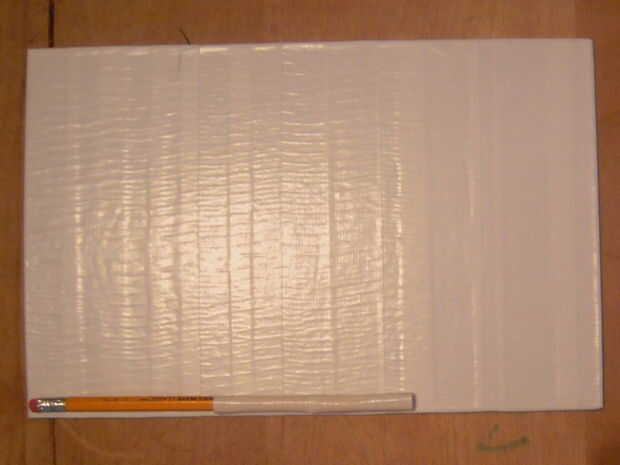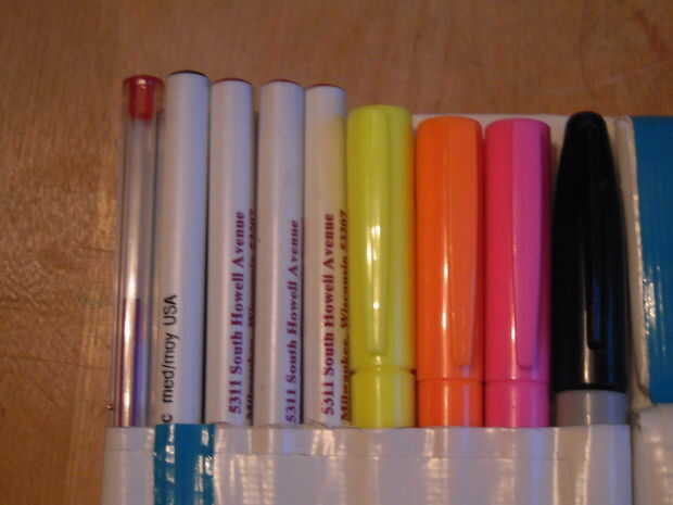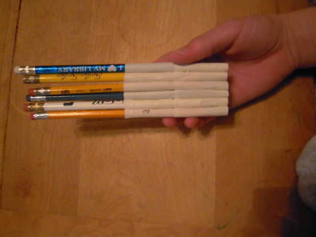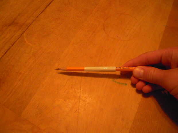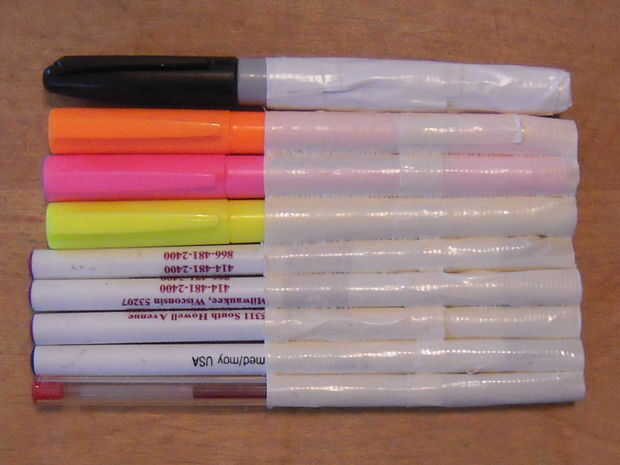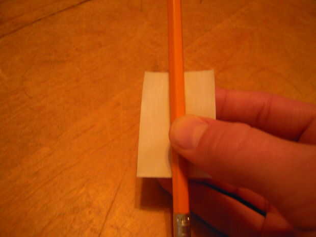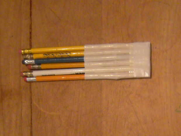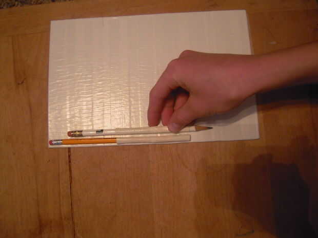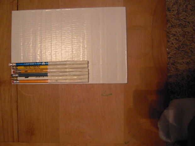 Este paso no es justo para los lápices, pero cualquier objeto con la misma forma básica. Marcadores, bolígrafos y lápices de colores incluso. Ahora estos bolsillos se hacen de 2 tiras de lado pegajoso de la cinta hacia fuera y 2 tiras de lado pegajoso en. Para ello, tendrás que cortar tus franjas a una buena longitud. Mina eran cerca de 1.5". Ahora lo que usted querrá hacer es que la tira y enróllelo verticalmente alrededor del lápiz. Usted querrá obtener tan estrecha como sea posible para un ajuste perfecto. A continuación, utilizando la misma tira de tamaño, envuélvalo lado pegajoso hacia fuera, pero con este más arriba en el lápiz. Las dos bandas deben superposición sólo ligeramente. Entonces, colóquelo donde va basado en el diagrama. Asegúrese de que al hacerlo la punta no está mostrando. Esa parte va a ser la parte inferior del bolsillo de todos modos. Repita estos pasos para todos sus lápices, colocándolas lado a lado. Una vez hecho esto, levante les todo desde la base, juntos.