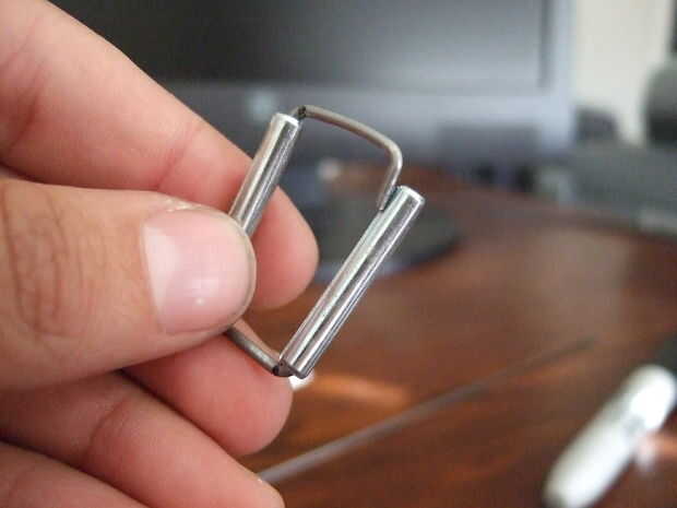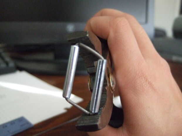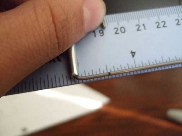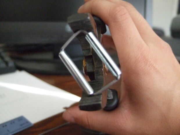 Desde la primera curva, medir ~0.5in y doble de la marca de otros 90 grados. Deslice un perno de tensión en el cable.