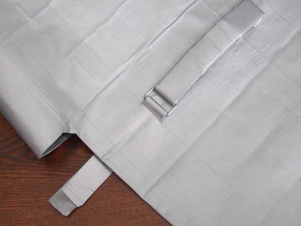 Deslice las manija de las correas de sostén en estas ranuras. Vuelta la bolsa y haz la regla sacrificial. Es demasiado larga y debe recortarse, en este caso. Marcar el área para recortar y recortar.