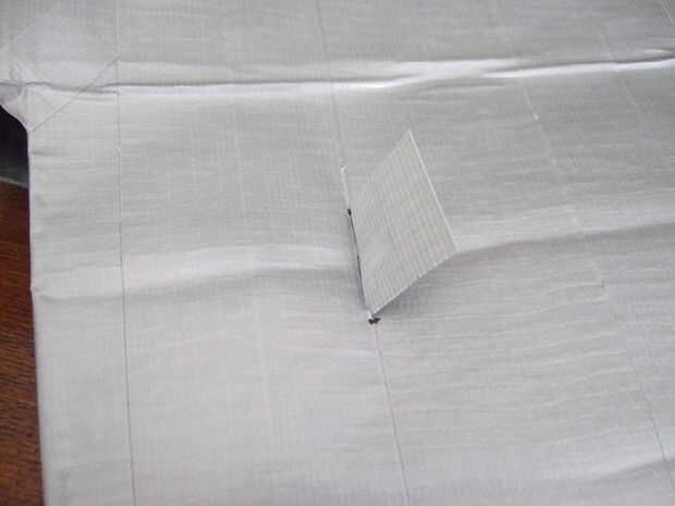 Esta parte es importante, ver cuadro #8 para la aclaración. Coloque un segmento de la cinta en una correa de anclaje que está en el centro de la bolsa, la regla de centrado sobre él, con cinta adhesiva. Con otro pedazo de cinta adhesiva, cinta del otro dentro de la correa de anclaje a la regla.