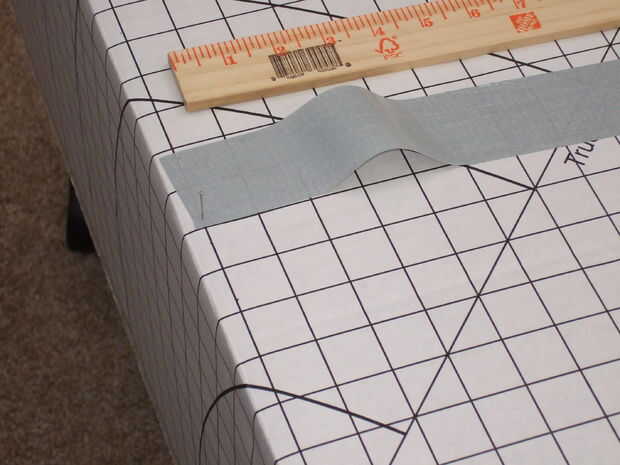 Corte 36 en una tira de cinta adhesiva. Con la cara de lado pegajoso hacia arriba, el pin de una esquina a la Junta. Asegúrese de que usted tendrá suficiente espacio a cada lado para dar cabida a todo el ancho de la hoja.