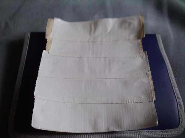 Poner la primera tira de cinta hacia abajo, el lado pegajoso hacia arriba y cortar otra pieza de aproximadamente el mismo tamaño.