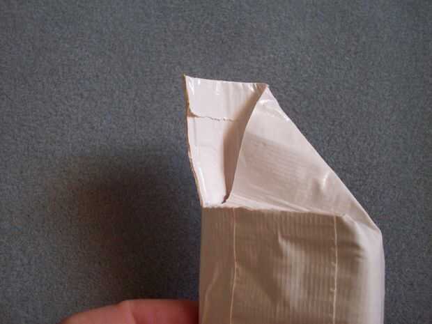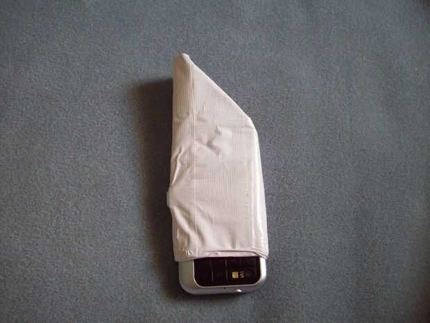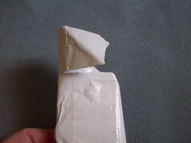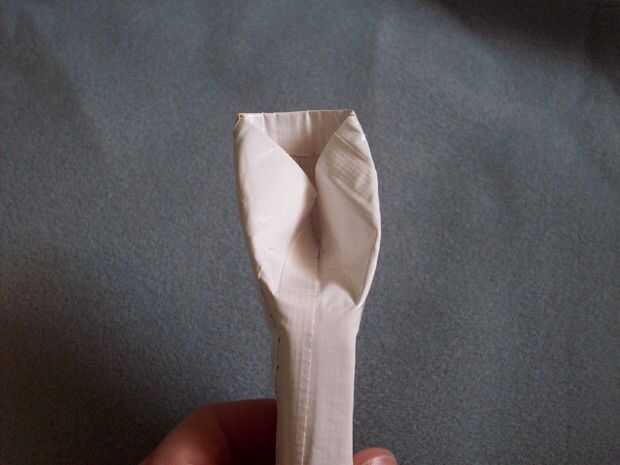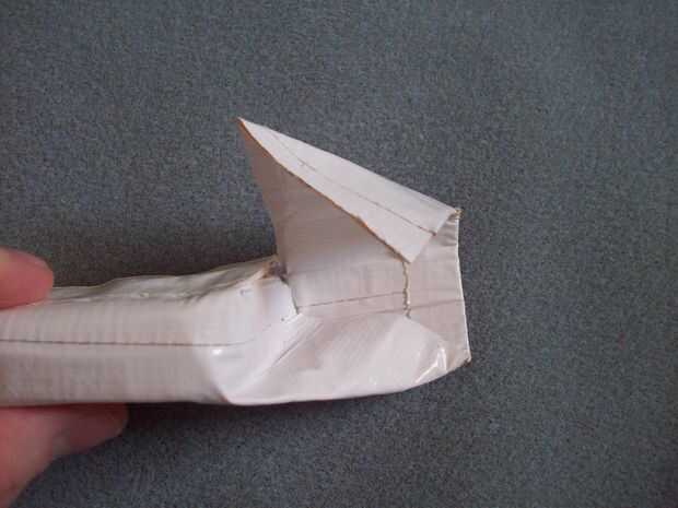 Devolver el teléfono al tubo y doble en uno de los lados cortos del final que se cerrará, como empezaría a doblar papel de envolver para regalo. Esto debe crear dos triángulos y un lado corto. Cortar uno de los triángulos de modo que quede al ras con el extremo del teléfono, en el pliegue del lado corto. Corte a lo largo de la esquina hasta el final del tubo para que el triángulo se quita.