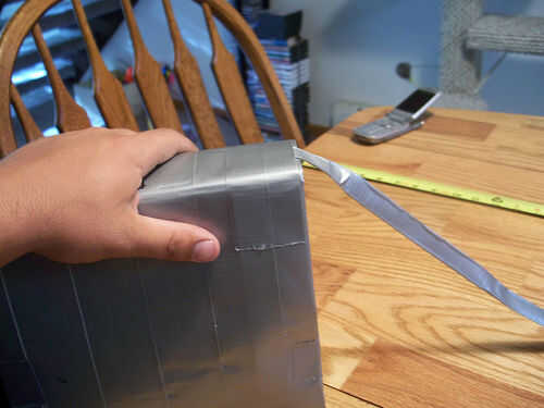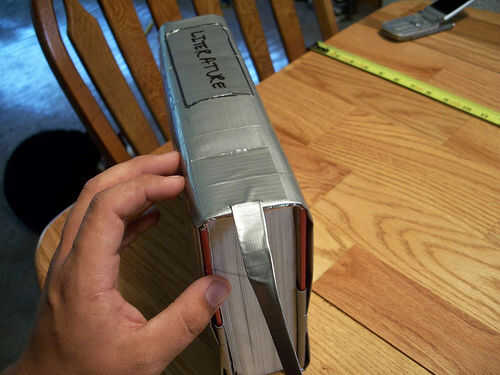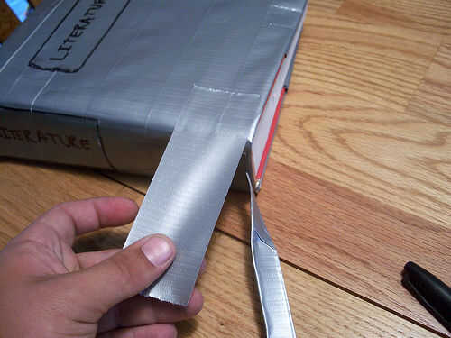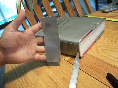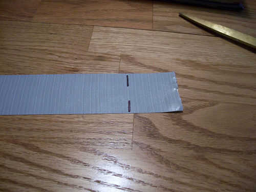 Tomar una tira de cinta adhesiva para conductos, cerca de 5 pulgadas más de largo que su libro es alto. La mía es de 14 pulgadas. A continuación, dos pulgadas de un extremo hace dos marcas. Si la tira está sentando delante de izquierda a derecha, hará que sus dos marcas verticalmente, bajando desde la parte superior 1/3 de la anchura de la cinta y la parte inferior 1/3 de la anchura. VER FOTO. Esto es muy importante. Cada marca es solamente 1/3 de la anchura de las cintas.