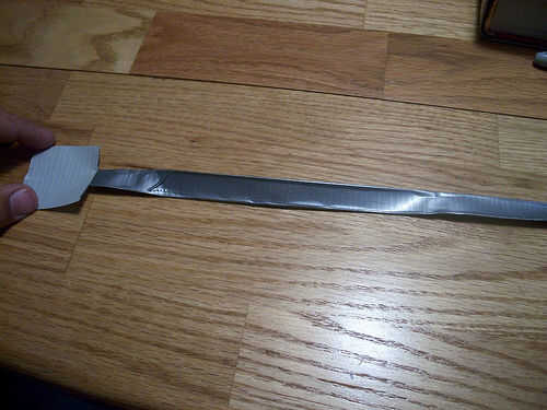 Ahora, corte a lo largo de esas marcas. Esta comunicados de los bordes de la tira, dejando los dos pulgadas por dos pulgadas pedazo pedazo unido a la más grande, por sólo un tercio de la tira. Doblar la parte inferior tercera de la pieza larga para arriba, luego seguir doblando el superior tercer down. Esto hace algo parecido a una cinta en la cola.