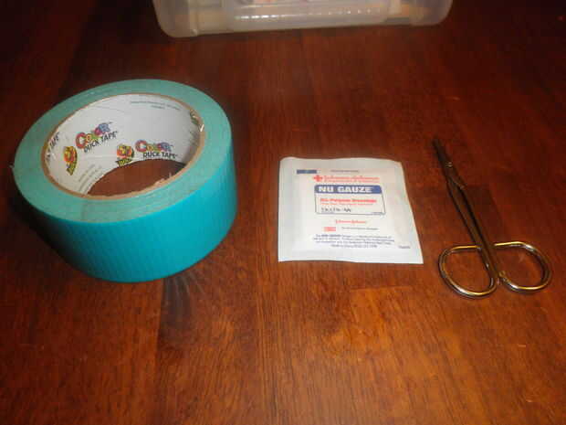 Determinar el tamaño de la herida a cubrirse. Asegúrese de que la herida esté limpia de suciedad. Si es posible utilizar antiséptico. Corte una longitud de Gasa y doblar el tamaño de la herida. Luego rasgar un pedazo de cinta adhesiva y coloque la gasa en el lado adhesivo de la cinta. Ponga el vendaje sobre la herida con gasa cubriendo la zona herida.