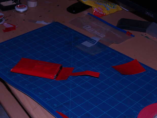 Tomar otra tira de cinta adhesiva alrededor de 8" de largo y cortar una larga tira de 1/2". Pliegan por lo que es pegarse a la tapa de ambos lados.