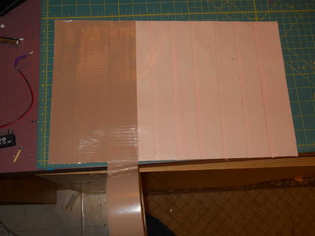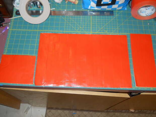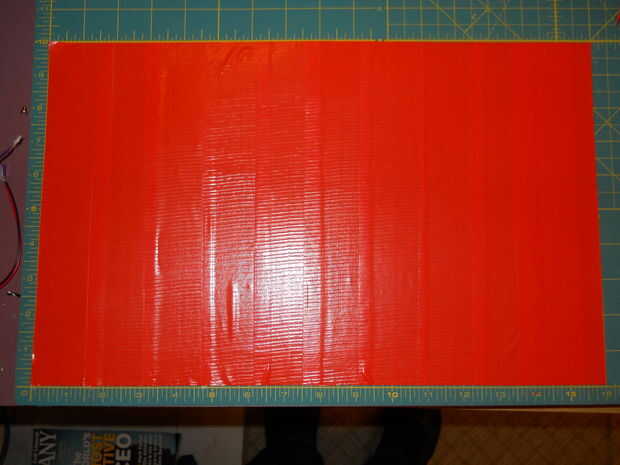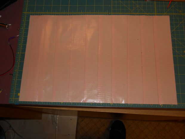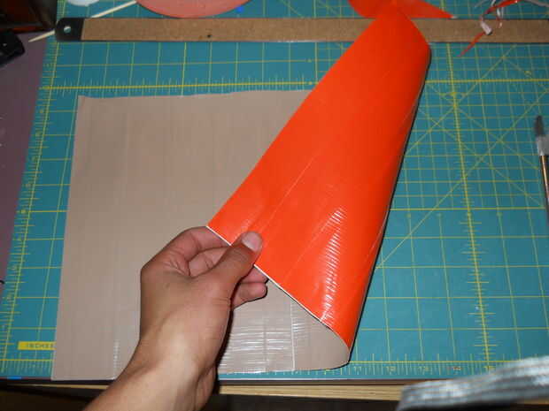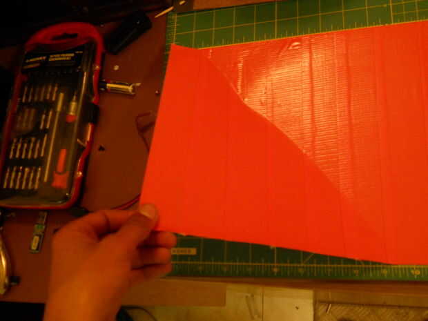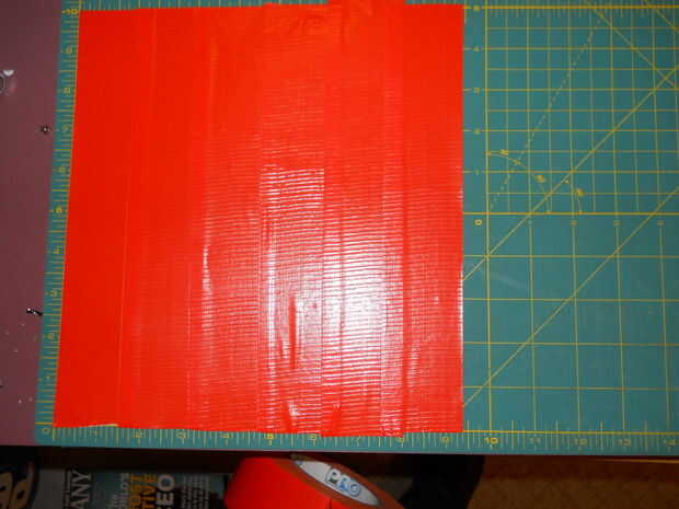 3) tome su 3er rodillo o si decides tienes suficiente del mismo color, cortar tiras de 12" de largo y comenzar a añadir la segunda parte. Los bordes deben ahora todos frente a izquierda y debe empezar a poner las tiras por principio a la izquierda. Esto hará que una costura fuerte. Además, asegúrese de su colocación. El tiempo que toma para pelar ductape fuera de él sí mismo es bastante largo y podría terminar en que reiniciar y perder la cinta. Dejar a un lado su hoja acabada.