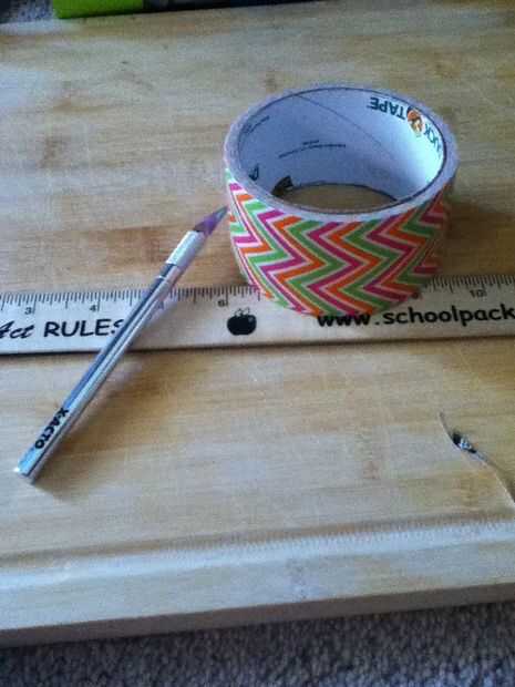 Para este proyecto se necesita el conducto cinta, un cuchillo xacto o tijeras, una regla y una superficie dura. La razón por qué usted necesita una superficie dura es 1 usted puede pegar (y despegar) cinta 2.it es de bastante útil si estás usando un cuchillo xacto. Yo uso una tabla para cortar pero se puede utilizar una tabla de cortar o la almohadilla de corte. No use la mesa de la cocina o el mostrador. No quiero marcas en todo su mobiliario de cortes.