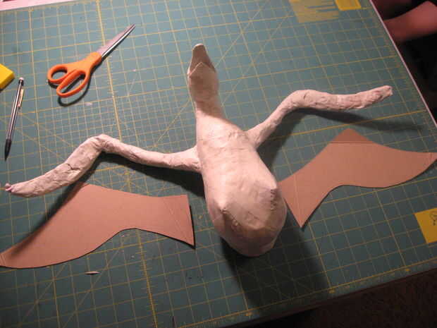 Las alas comenzaron con periódico y cinta adhesiva y cartulina fue agregada con pegamento caliente para desarrollar aún más la forma.