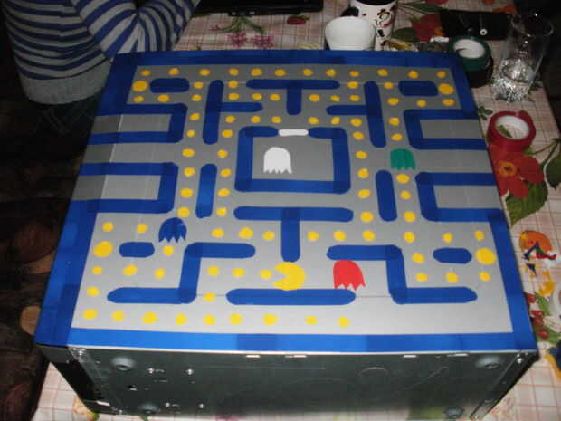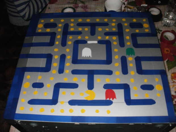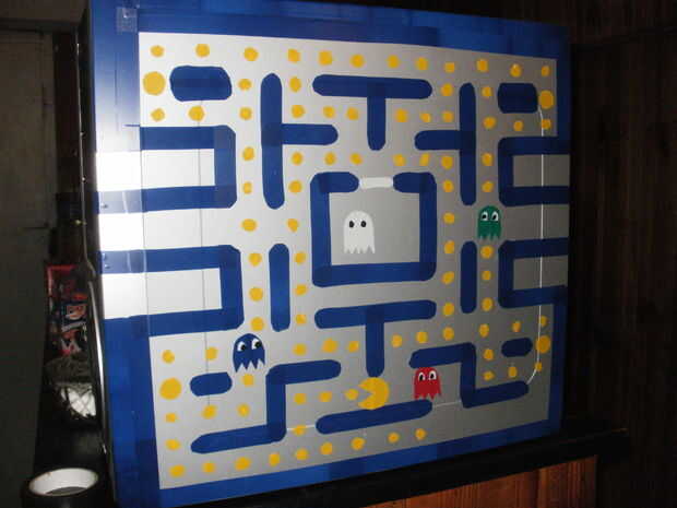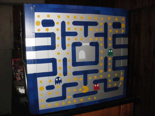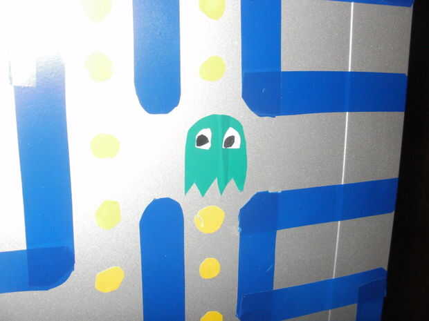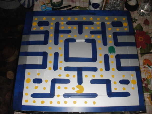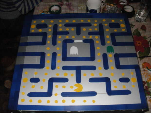 Pac man por supuesto fue el mayor punto en la imagen de la cinta amarilla con una brecha de triángulo grande para una boca. Los monstruos también eran fáciles de hacer. Algunos de ellos no son el color original pero eso era lo que podía hacer con los materiales que tenía. los ojos de los monstruos se hacen de cinta blanca y negra cortados en pequeños puntos.