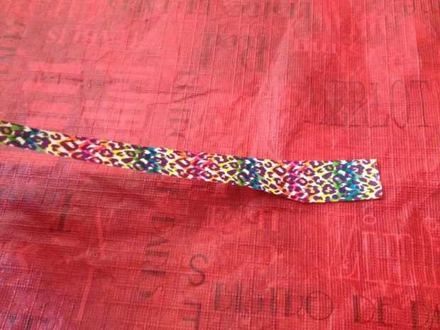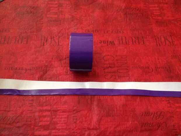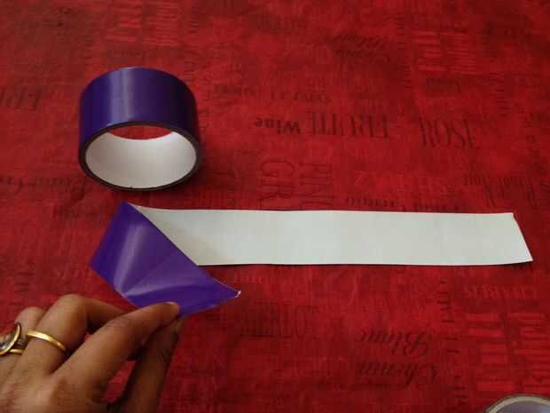 Mide 40 cm y cortar. Dejar 1/3 de la parte adhesiva hacia fuera y dobla la anchura de la cinta.