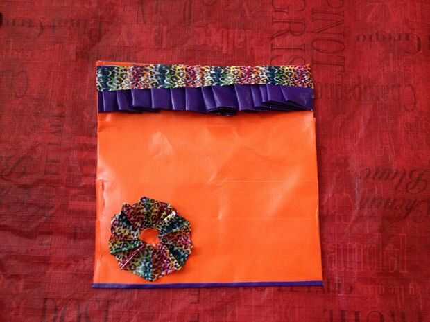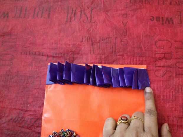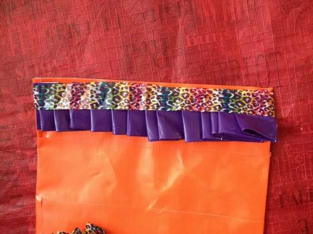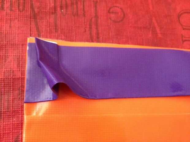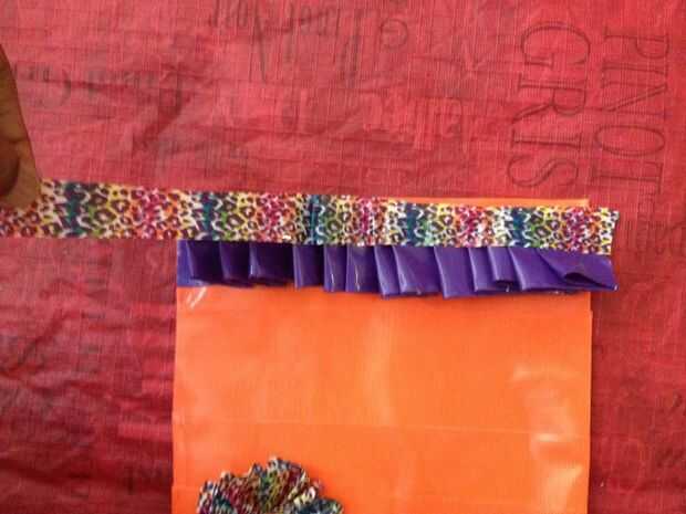 Corte tiras pequeñas (menos de medio centímetro) de color púrpura como la anchura de cremallera bolso de la cerradura y pegarlo en la parte inferior de la bolsa de. Corte cinta extra en ambos lados.