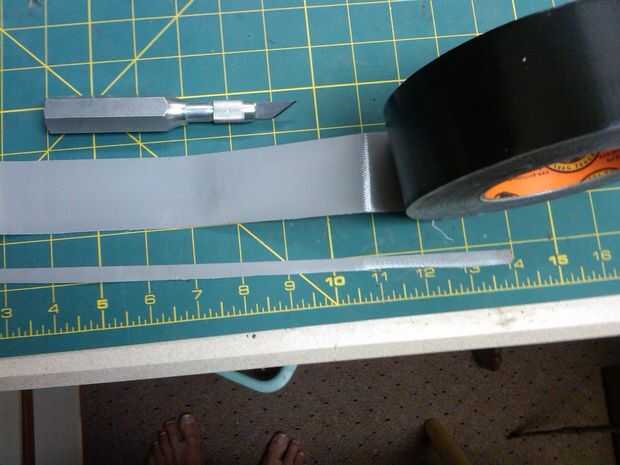 La siguiente acción a tomar consiste en la creación de tiras largas de cinta para ser usado para reemplazar la cuerda sosteniendo la parte de "X" de las raquetas de nieve detrás junto. Esto proporciona una envoltura resistente que será la primera porción de la cinta permanente en las raquetas. Al completar el proyecto mismo, utiliza un cuchillo del exacto para cortar las tiras del largo de la cinta pero encontré casi al final que simplemente rasgando la cinta longitudinal es más eficiente y en todo más ordenado.
